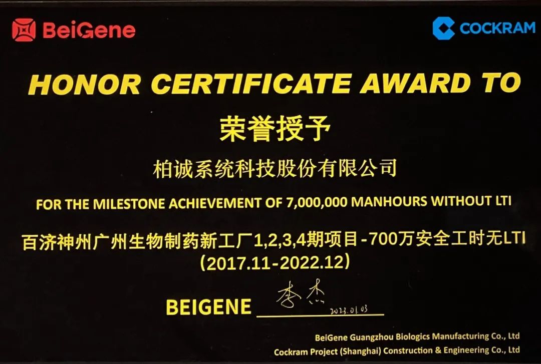 近期,BOTH憑借在廣州百濟項目中的安全工作獲得業(yè)主百濟神州生物制藥及管理公司上海科克雷蒙的高度肯定,榮獲“700萬安全工時”嘉獎。