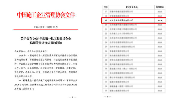 近期,中國施工企業(yè)管理協(xié)會正式發(fā)布《關(guān)于公布2025年度第一批企業(yè)信用等級評價結(jié)果的通知》,柏誠系統(tǒng)科技股份有限公司(以下簡稱“BOTH”)作為復(fù)評企業(yè),順利通過評審,再次榮獲“AAA信用等級”證書。這一認證體現(xiàn)了公司在合規(guī)經(jīng)營、誠信履約及綜合實力等方面的持續(xù)領(lǐng)先優(yōu)勢。
