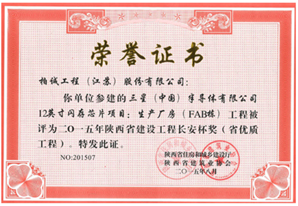 近日,我司參建的三星(中國)半導(dǎo)體有限公司12英寸閃存芯片項目:生產(chǎn)廠房(FAB棟)工程被評為2015年度陜西省建設(shè)工程長安杯(省優(yōu)質(zhì)工程獎)。