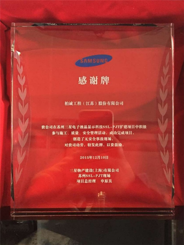 近日,我司在蘇州三星項(xiàng)目施工中積極參與施工、質(zhì)量、安全管理活動(dòng),成功完成項(xiàng)目,創(chuàng)造了無(wú)安全事故現(xiàn)場(chǎng),三星物產(chǎn)建設(shè)(上海)有限公司特頒發(fā)“感謝牌”以示表彰。