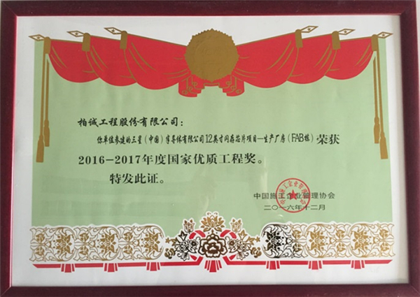 2016年12月,我司參建的三星(中國)半導(dǎo)體有限公司12英寸閃存芯片項(xiàng)目-生產(chǎn)廠房(FAB棟)榮獲“2016-2017年度國家優(yōu)質(zhì)工程獎(jiǎng)”。