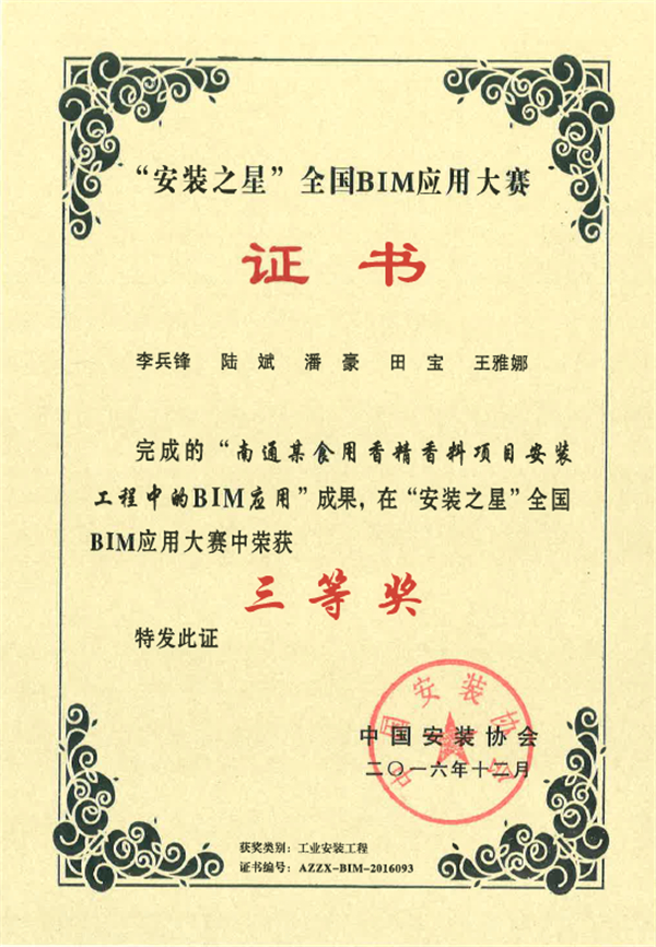 近期,在中國安裝協(xié)會(huì)主辦的“安裝之星”全國BIM應(yīng)用大賽中,公司參賽作品“南通某食用香精香料項(xiàng)目安裝工程中的BIM應(yīng)用”喜獲三等獎(jiǎng),特此通報(bào)。