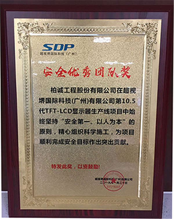 我公司承建的超視堺國(guó)際科技(廣州)有限公司增城817建廠專(zhuān)案項(xiàng)目開(kāi)工至今,安全工作高效,實(shí)現(xiàn)了“安全零事故”目標(biāo),因此業(yè)主方廣州超視堺國(guó)際科技有限公司向我公司SDP項(xiàng)目部頒發(fā)了“安全優(yōu)秀團(tuán)隊(duì)獎(jiǎng)”予以表彰,同時(shí)項(xiàng)目安全主管張高飛獲得“安全生產(chǎn)先進(jìn)個(gè)人”證書(shū)。