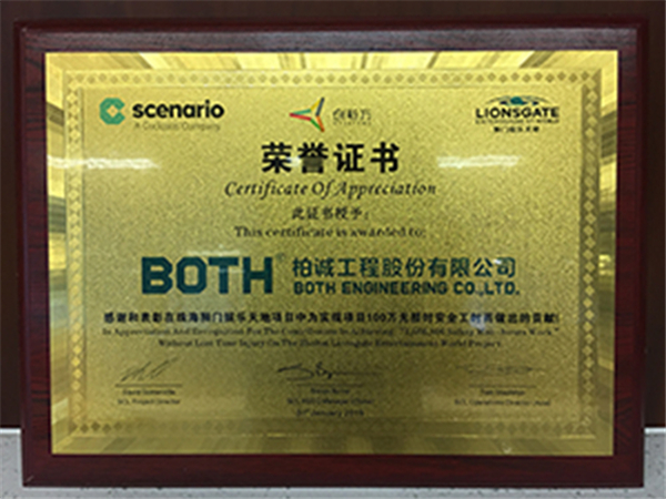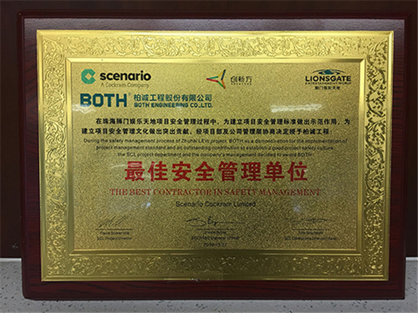 2019年3月,公司在珠海獅門娛樂天地項目中喜獲“最佳安全管理單位”獎狀,同時,因為該項目已達(dá)到100萬無損失安全工時,因此業(yè)主方給項目部頒發(fā)了“100萬無損時安全工時”獎狀。